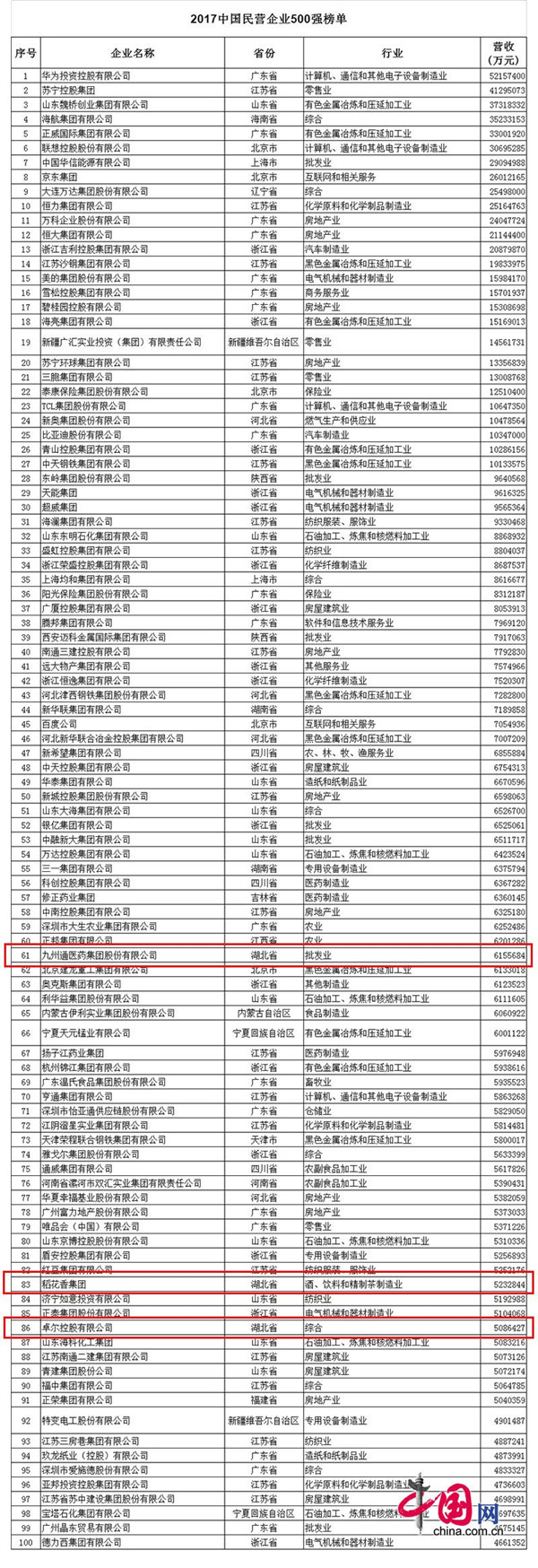 此次湖北省有19家民营企业入围,入围企业数量中部第一,全国第五。九州通医药集团、稻花香集团、卓尔控股三家企业进入前100强,分别位列500强第61、83、86位。合众人寿、天茂实业集团、人福医药集团三家民营企业首次进入500强。