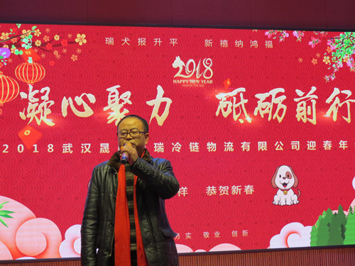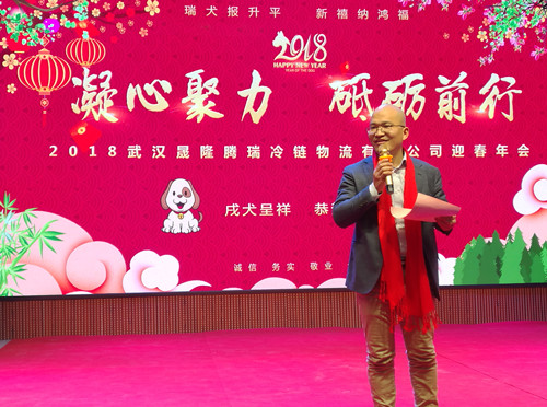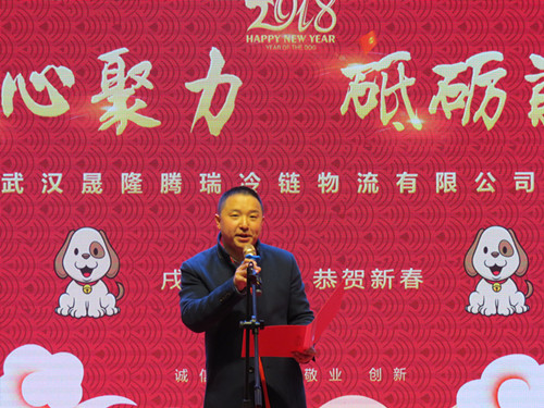 武汉晟隆腾瑞冷链物流有限公司董事长何鑫发表致辞,向来宾介绍了2017年公司取得的优异成绩,同时感谢广大合作伙伴的支持与信任,感谢公司员工的辛勤付出。他表示,在新的一年里,公司将继续发挥优势,开拓思路,与合作伙伴携手共进,争取取得更大的成绩。
